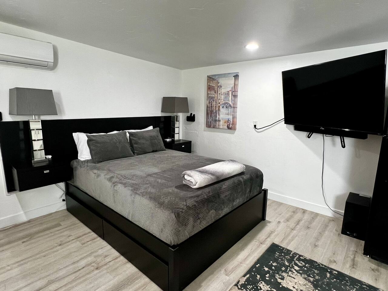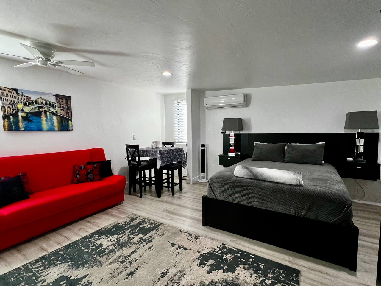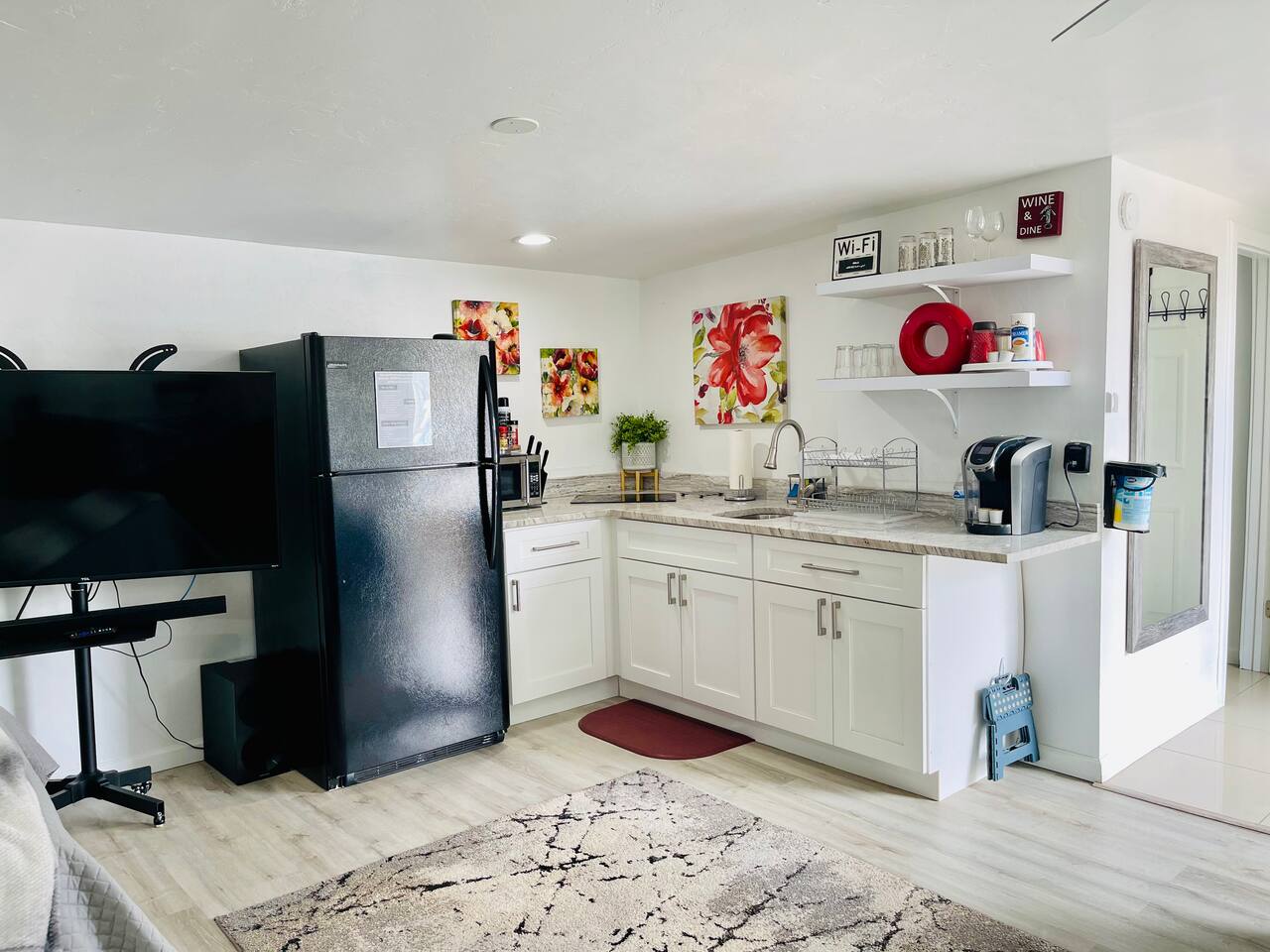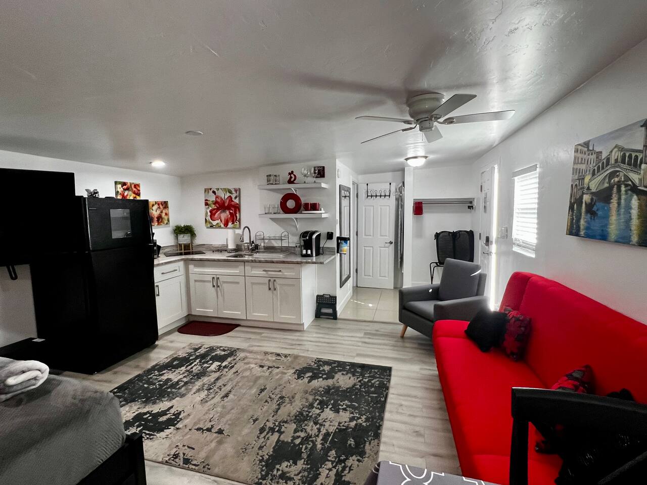 • Larger vehicle’s – motorhome, truck trailer, box truck ARE allowed on property. • No pets, parties/events, or unauthorized guests, sleeps 3 max including adults/Kids, $100 fee if you have additional guest more than 3 guests. • All types of smoking are strictly prohibited inside the studio including vaping and e-cigarettes. We charge a $150 fee PLUS the entire cost of deep cleaning and restoring the property to its smoke-free condition. • Security Camera located in the parking area on property (Camera are for security & guest safety) • Another home is located on property in a separate building (NO SHARED WALLS), and the renter does have an inside dog. • There is a washer / dryer on the property that is shared with another renter. The washer / dryer is located behind another building on the property. Laundry soap is NOT provided. • Provide 2 bottles of water and 2 - k cup per booking, regardless of how long this stay is.