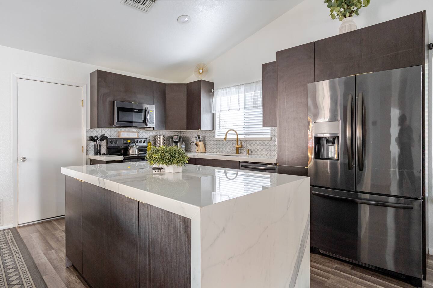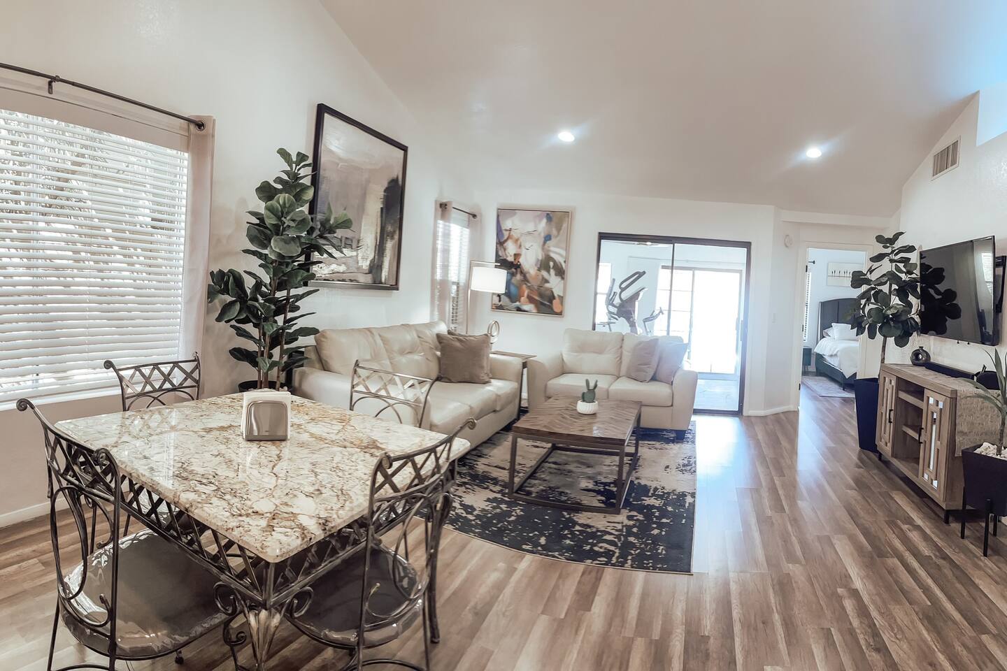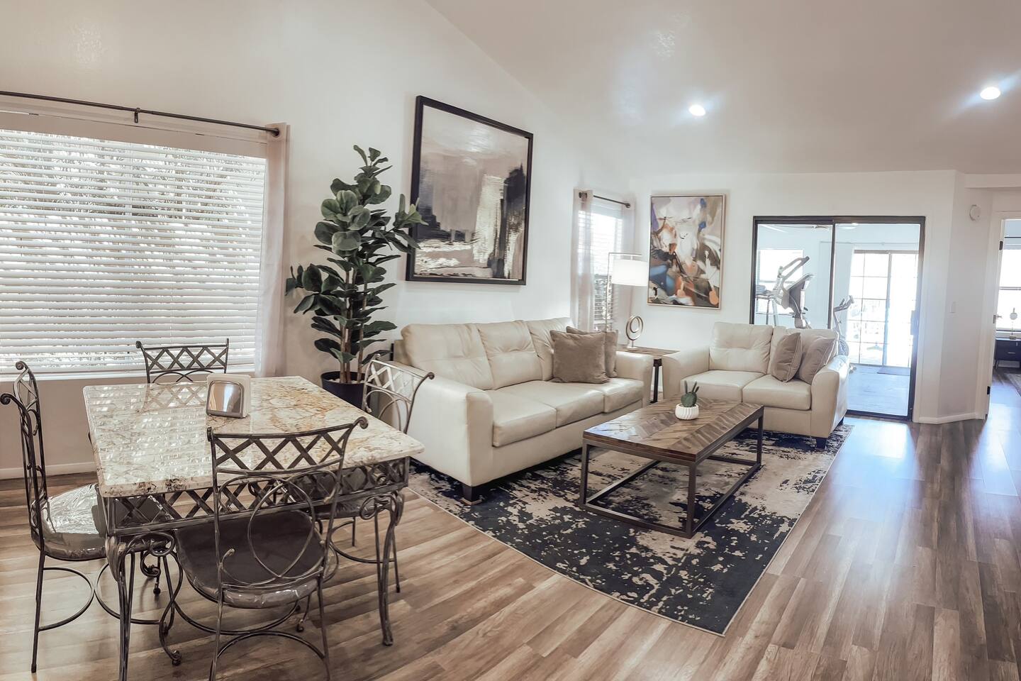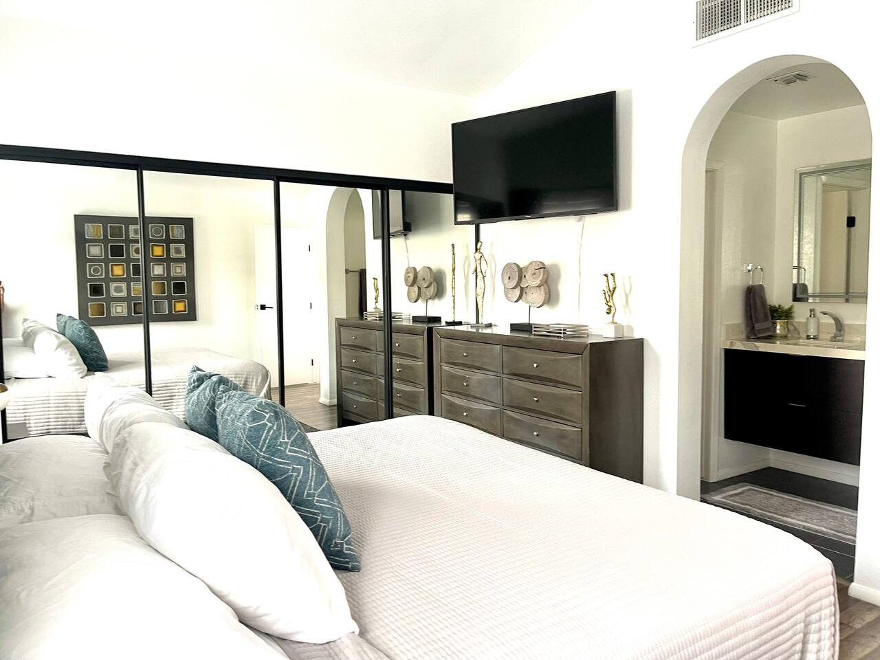 From the moment you enter our home you can see everything that you need for your perfect desert getaway including comfortable furnishings and attention to detail with a fully stocked kitchen. Our comfortable home is stocked just the way we would want it, so you’ll have everything you need when you stay with us! *** LIVING SPACES ** In this living room you’ll melt right into those buttery soft leather sofas. With another large screen TV with WiFi, streaming apps, you can either choose another movie or favorite show, or maybe just a quiet space to read your book or catch up on social media. *** KITCHEN AND DINING*** The kitchen has been totally remodeled and fully stocked with stainless steel appliances, and all the gadgets that you’ve come to know, love, and depend on. We offer Keurig single cup we provide a couple pods or a Coffeemaker w/ coffee ground. We also supply a blender, toaster, mixer, we’ve totally got you covered for simple and healthy family meals. A spacious center island provides both additional food prep space and an ideal spot to pull up a stool for a cup of coffee or conversation with the chef. We also offer two separate dining tables, high top table (6 seating) and a standard table (4 seating). ***BEDROOMS AND BATH*** • The primary bedroom has an ensuite bathroom with a king-sized bed, sound machine, robes and free-standing fans and TV • The other two bedrooms are a 1 queen bed and 2 twins’ beds, that is a trundle that has a shared hallway bathroom. • In all the bedrooms there are ceiling fans, blackout shades, luggage racks, beside lamps, dresser’s, comfy sheets, 4 pillows per bed. ***PRIVATE CARDIO ROOM IN HOME *** Offers Treadmill, Stepper, Studio Bike, Light weights and workout bands. The home is 5 min from Omni Golf Course, 10 mins from Tucson Premium Outlets, 15 min from El Conquistador Gold Course, 20 min to downtown Tucson, 25 mins to U of A, 30 mins to Tucson International Airport.