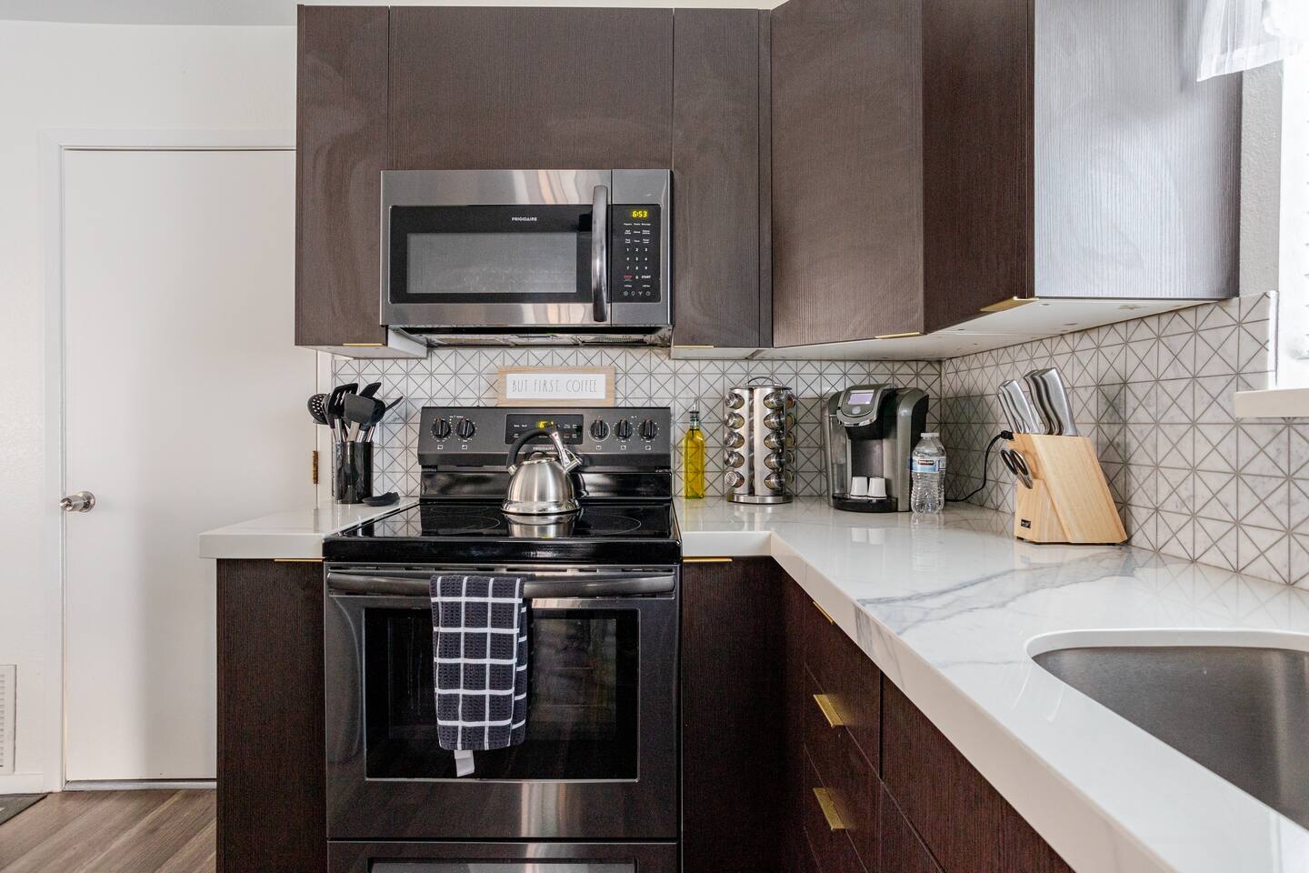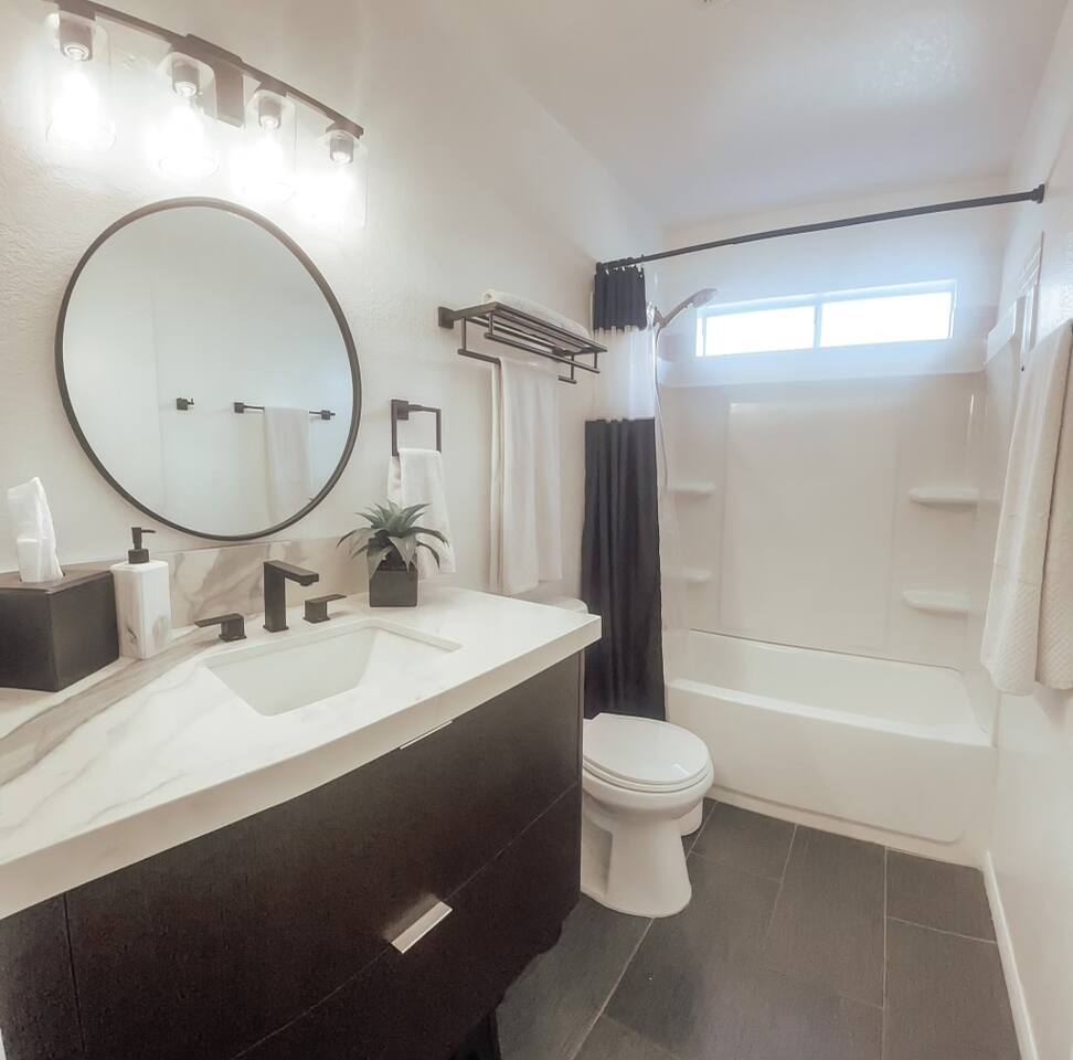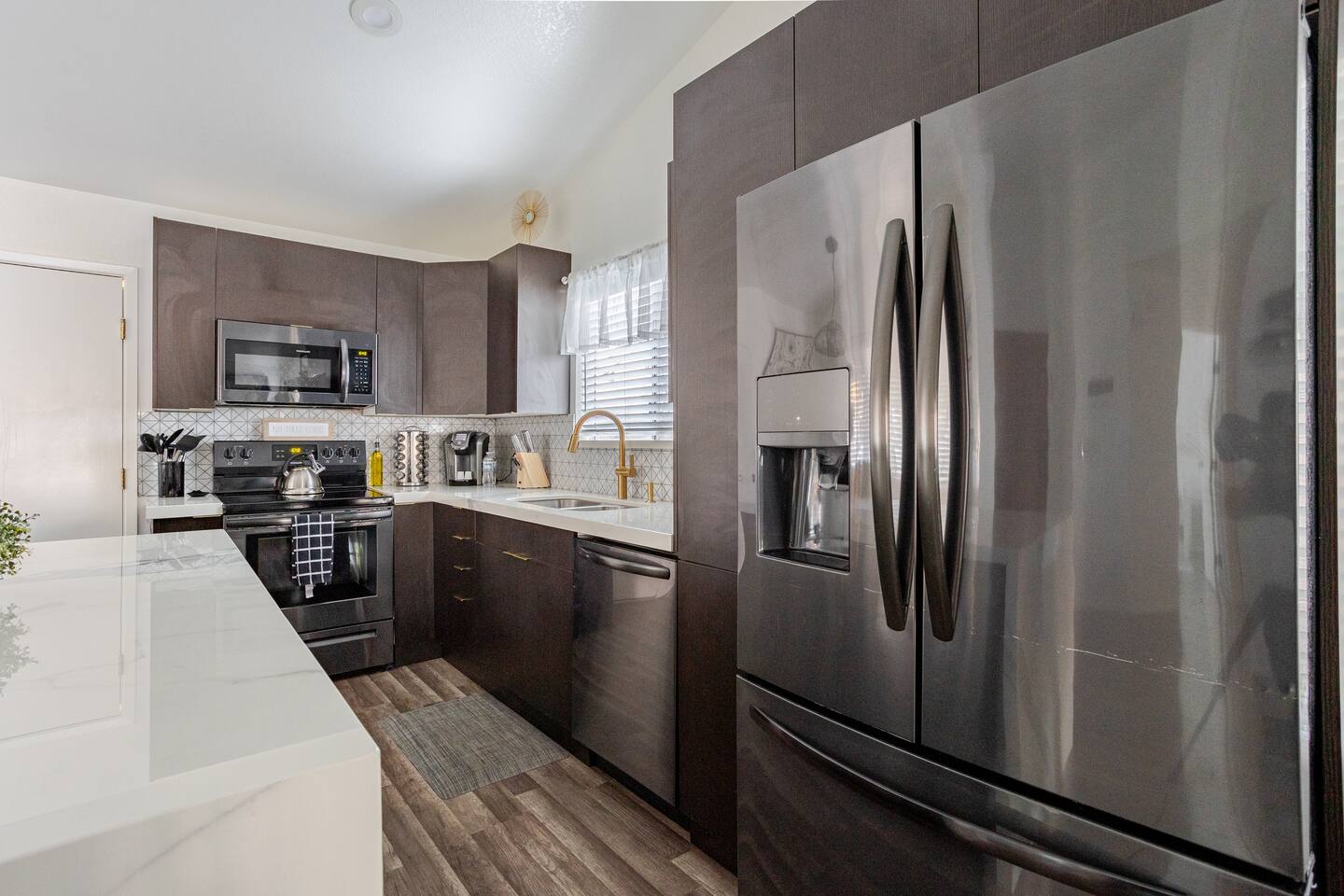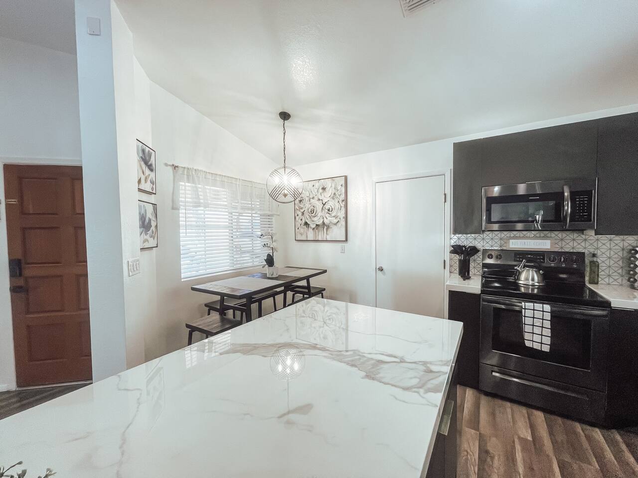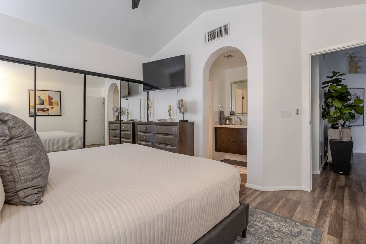 From the moment you enter our home you can see everything that you need for your perfect desert getaway including comfortable furnishings and attention to detail with a fully stocked kitchen. Our comfortable home is stocked just the way we would want it, so you’ll have everything you need when you stay with us! *** LIVING SPACES ** In this living room you’ll melt right into those buttery soft leather sofas. With another large screen TV with WiFi, streaming apps, you can either choose another movie or favorite show, or maybe just a quiet space to read your book or catch up on social media. *** KITCHEN AND DINING*** The kitchen has been totally remodeled and fully stocked with stainless steel appliances, and all the gadgets that you’ve come to know, love, and depend on. We offer Keurig single cup we provide a couple pods or a Coffeemaker w/ coffee ground. We also supply a blender, toaster, mixer, we’ve totally got you covered for simple and healthy family meals. A spacious center island provides both additional food prep space and an ideal spot to pull up a stool for a cup of coffee or conversation with the chef. We also offer two separate dining tables, high top table (6 seating) and a standard table (4 seating). ***BEDROOMS AND BATH*** • The primary bedroom has an ensuite bathroom with a king-sized bed, sound machine, robes and free-standing fans and TV • The other two bedrooms are a 1 queen bed and 2 twins’ beds, that is a trundle that has a shared hallway bathroom. • In all the bedrooms there are ceiling fans, blackout shades, luggage racks, beside lamps, dresser’s, comfy sheets, 4 pillows per bed. ***PRIVATE CARDIO ROOM IN HOME *** Offers Treadmill, Stepper, Studio Bike, Light weights and workout bands. The home is 5 min from Omni Golf Course, 10 mins from Tucson Premium Outlets, 15 min from El Conquistador Gold Course, 20 min to downtown Tucson, 25 mins to U of A, 30 mins to Tucson International Airport.